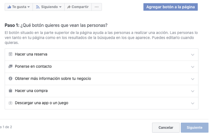 Un botón muy relevante por el tipo de acciones que permitirán hacer al usuario en tu página, sin duda alguna es el botón de “llamado a la acción” o “call to action”. Aquí puedes solicitar al usuario por ejemplo:  te contacte mediante un mensaje directo vía mesenger o whats app, te haga una llamada telefónica, o se dirija a tu página web directamente, todo esto con sólo darle clic al botón. Sin embargo, las opciones son aún más amplias pudiendo hacer que las personas reserven, descarguen una aplicación o vean un video si es el caso.