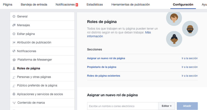 Para administrar una Página de Facebook puedes designar diversos roles para que otros usuarios puedan aportar. Cuando creas una página de Facebook, automáticamente te conviertes en administrador y puedes asignar y cambiar roles. Para hacerlo sólo debes ir a Configuración – Roles de Página – Asignar Rol (para asignar un rol a una persona debes colocar su nombre de usuario en Facebook o correo electrónico asociado a su cuenta de Facebook y enviar solicitud)